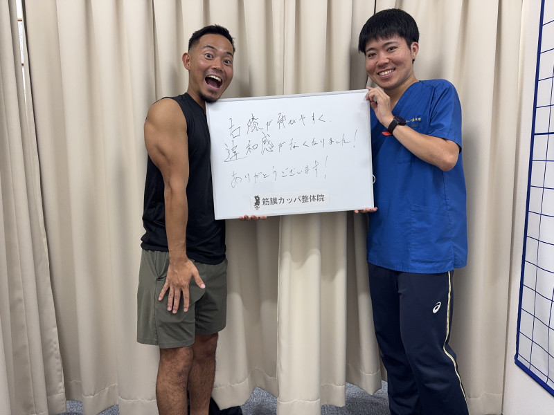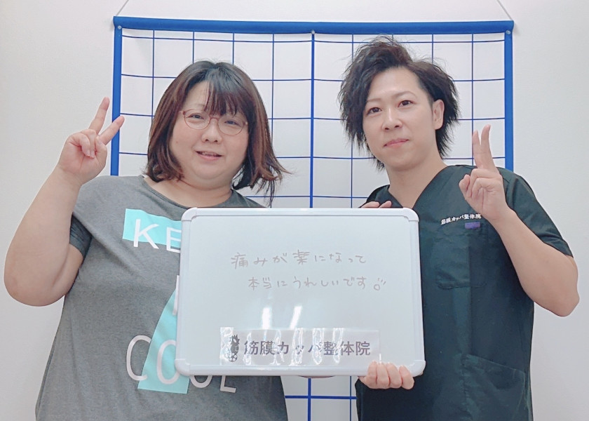 Q、あなたと同じような症状でお悩みの皆様へメッセージがありましたら教えてください。 A、痛みをとるには筋膜の硬い部分をほぐす事がとても大事だと実感しています。生活をしていく中で痛みを感じた時、我慢せず整体の施術を受けてみると良いと思います。