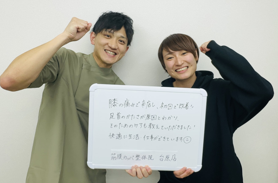 Q、当院の施術を受けてみていかがでしたか? A、徐々に膝の痛みが改善し、ソフトテニスも痛みなくできるようになりました。あぐらも当初に比べると随分やりやすくなりました。