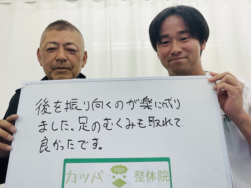 Q、同じような症状でお悩みの皆様へメッセージがありましたら教えてください。 A、我慢して放っておいてもいいことはないと思います。早めに対処が必要です。カッパ整体院をお勧めします。