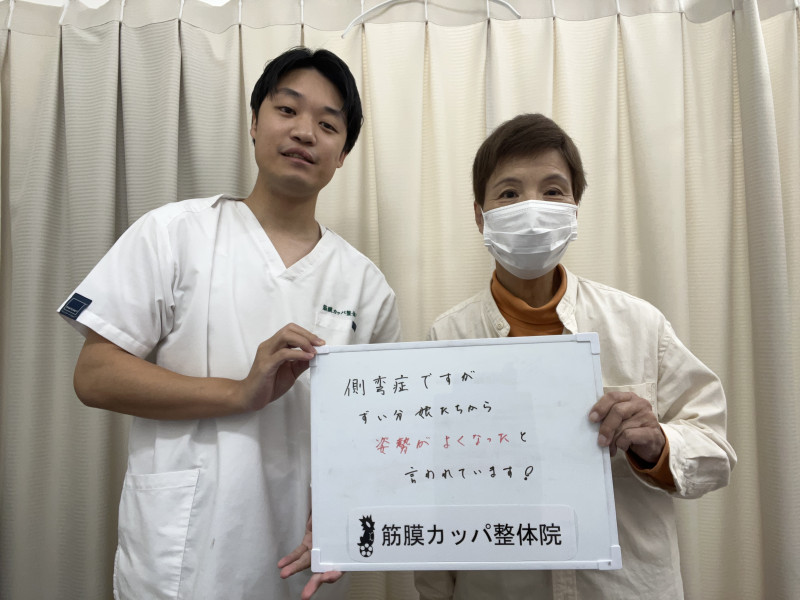 Q、実際に当院に来られてみて、どのように変わりましたか?(具体的に) A、全くだめだと思っていた身体の曲がりが治ってき、希望が持てるようになりました。 先日久しぶりに会った娘から「お母さん、身体が真直ぐになってきたね」と言われ、とても嬉しかったです。