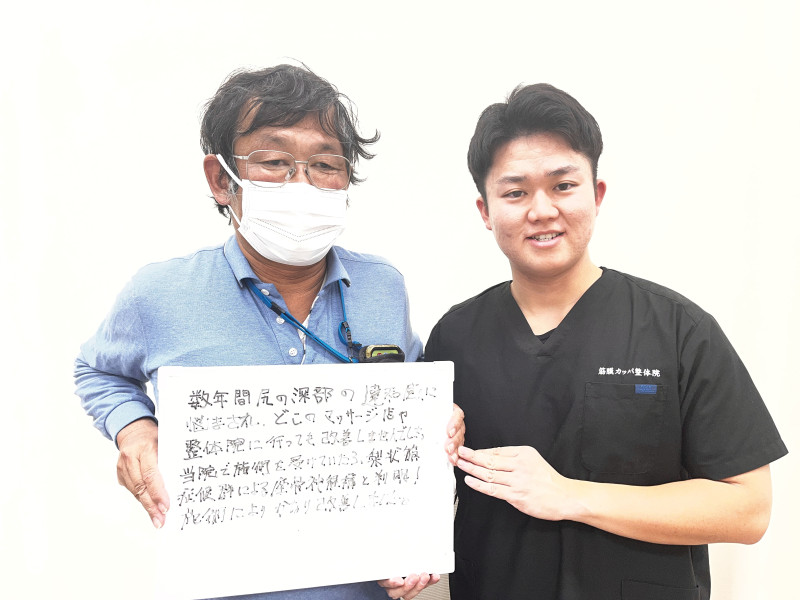 Q、実際に当院に来られてみて、どのように変わりましたか?(具体的に) A、どこのマッサージ店や整体院に行っても改善しなかったが、カッパ整体院で施術を受けたらかなり改善した。