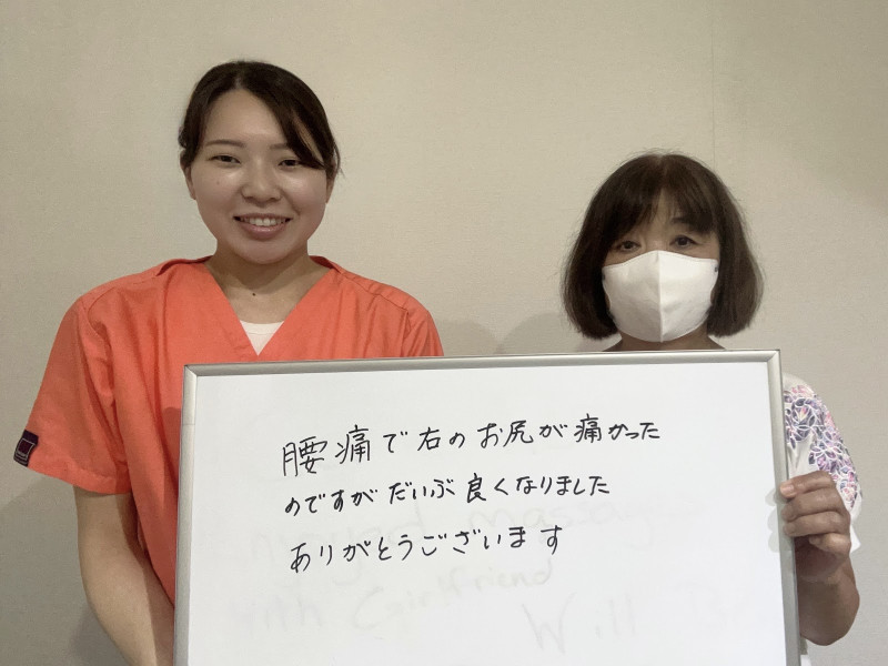 「日常生活に支障があったお尻の付け根からふくらはぎの痛みがなくなり楽になりました!感謝しています。」